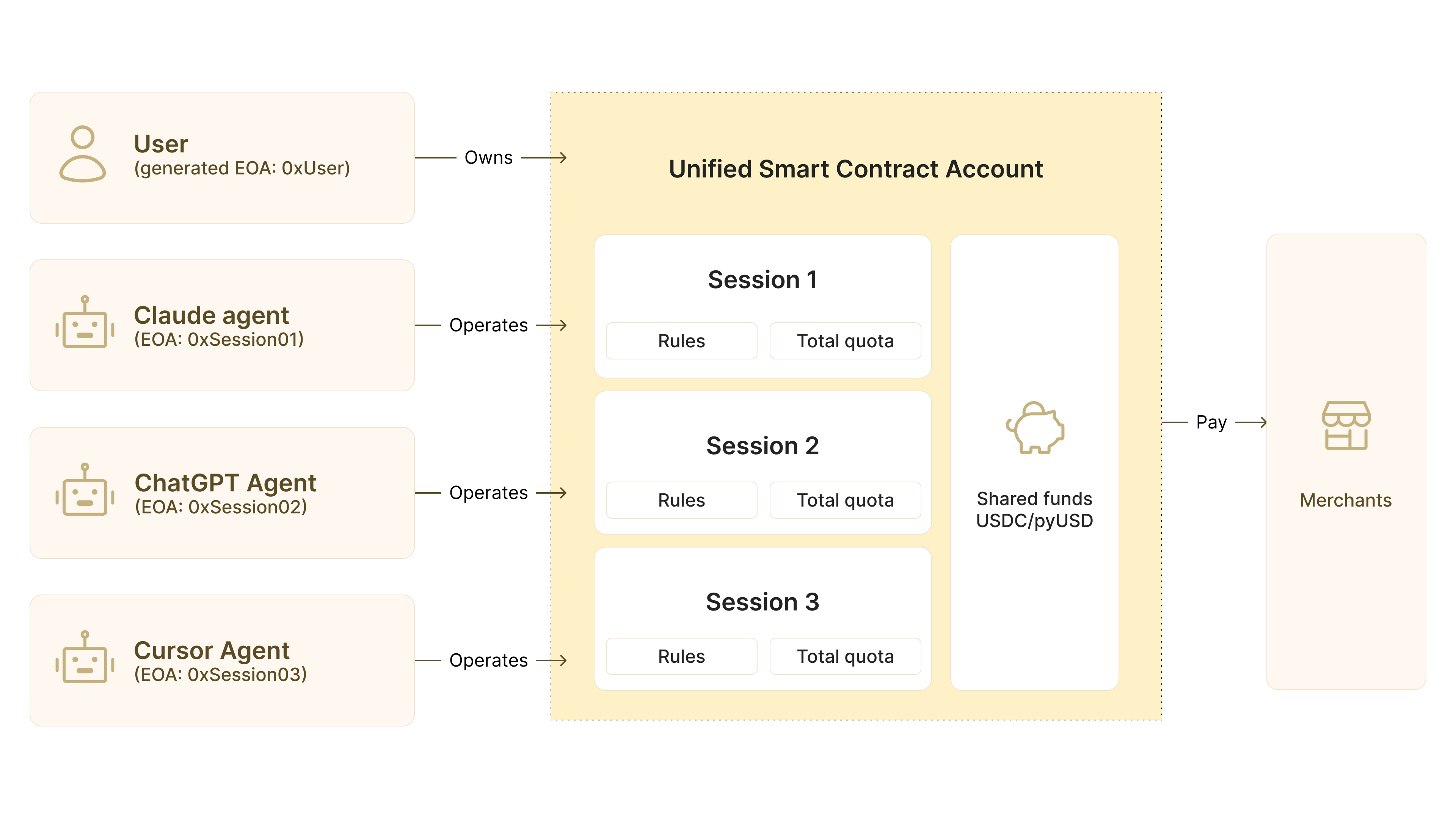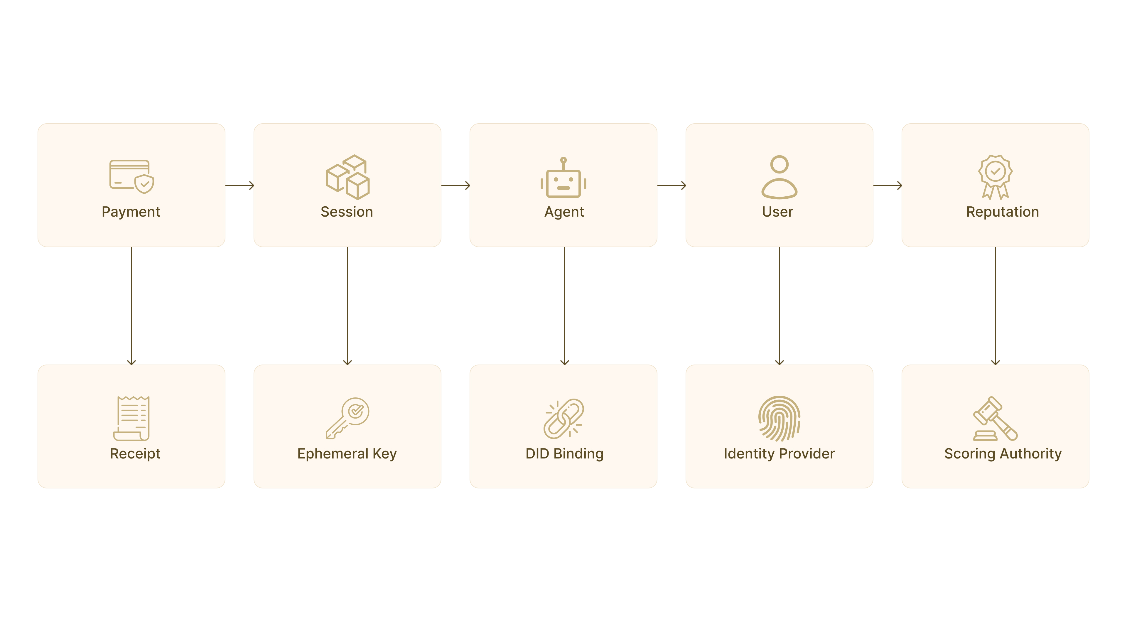 • Agent–first authentication: Hierarchical wallets with cryptographic principal binding